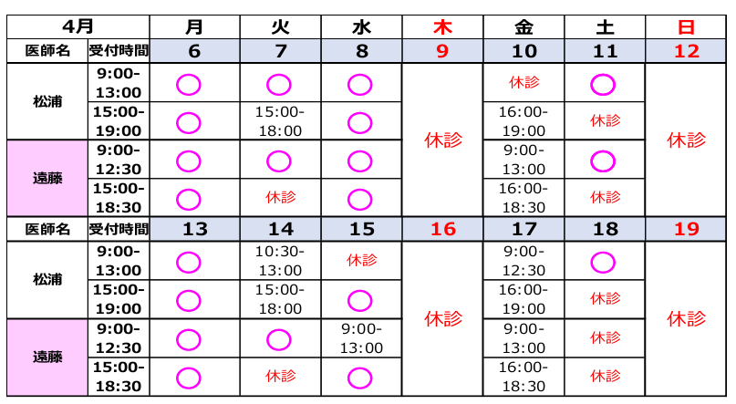 | 9:00 - 13:00、15:00 - 19:00 ※火曜は15:00~18:00 ※金曜は16:00~19:00 ※土曜日は午前中のみの診療 木曜・日曜・祝日休診 |