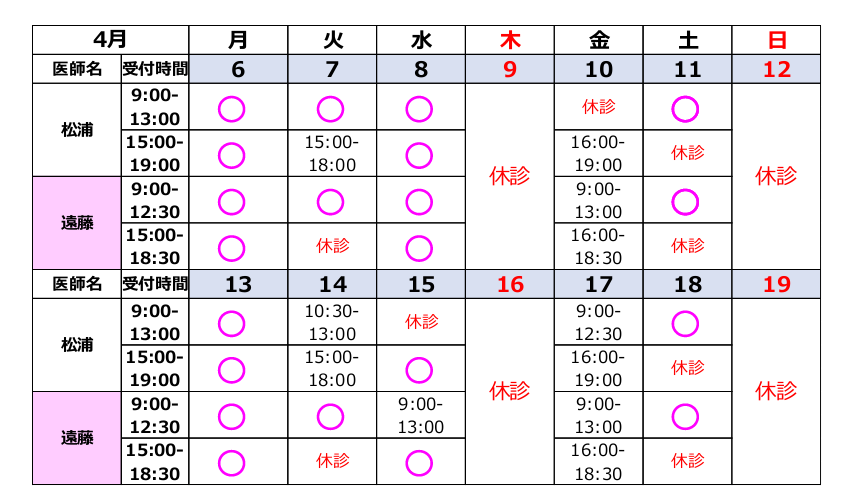| 9:00 - 13:00、15:00 - 19:00 ※火曜は15:00~18:00 ※金曜は16:00~19:00 ※土曜日は午前中のみの診療 木曜・日曜・祝日休診 |