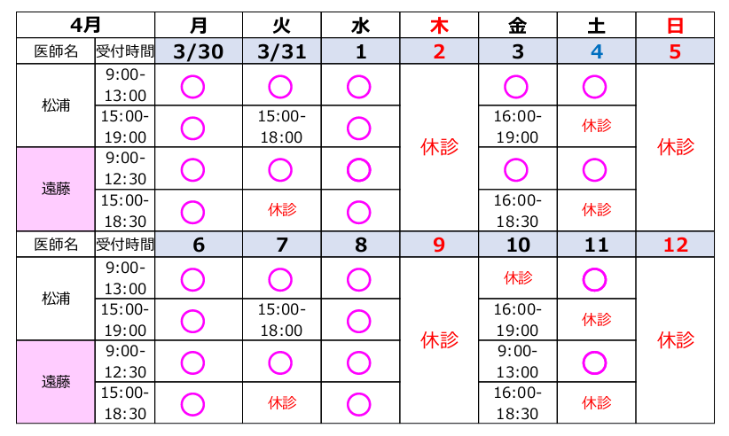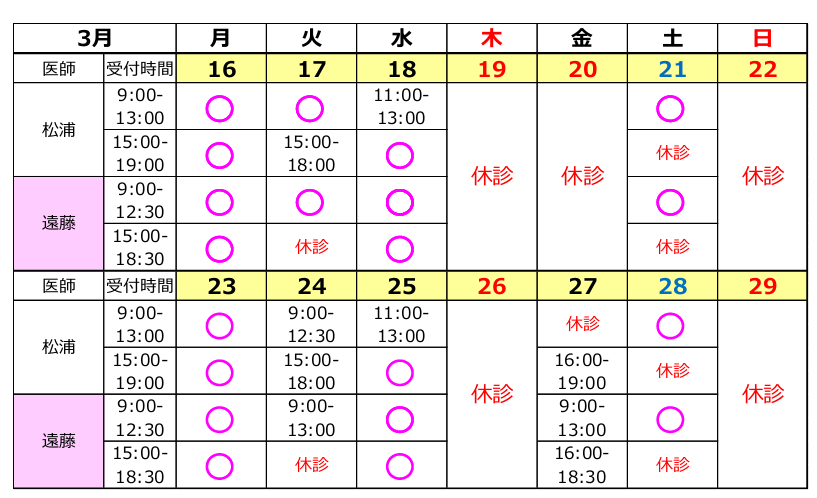 | 9:00 - 13:00、15:00 - 19:00 ※火曜は15:00~18:00 ※金曜は16:00~19:00 ※土曜日は午前中のみの診療 木曜・日曜・祝日休診 |